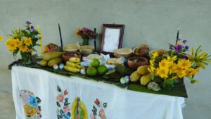 Además, los jóvenes de la cabina de Tahdziú elaboraron un altar en el que ofrecieron las comidas típicas que solían disfrutar los difuntos, como atole dulce; el atole salado; los elotes; el iswua, una tortilla hecha de maíz nuevo; relleno negro; tortillas; tamales; agua; mandarinas; plátanos y dulces tradicionales. En el altar también colocaron una cruz, una foto del difunto como parte de la ofrenda, velas de colores y sahumerio con incienso. Para finalizar la actividad tuvieron un pequeño convivio comiendo las comidas ofrendadas. Ko’one’ex mu’uk’ankunsik ek miatsil te kaajal.